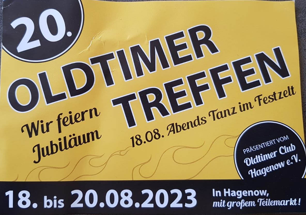 18. bis 20. August 2023 in Hagenow mit großem Teilemarkt. Am 18. August abends Tanz. Veranstalter: Oldtimer Club Hagenow